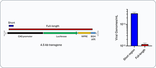 Short-region assays detect any genome fragment that contains the probed sequence. This includes partially packaged, truncated, or fragmented species that retain the internal region but lack essential 5′ or 3′ elements required for functional expression. As a result, short-region titer can substantially overestimate the number of therapeutically competent vectors in the preparation.