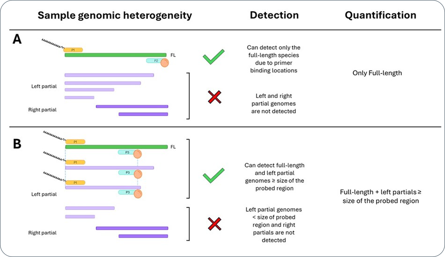 In the full-length assay (Panel A), primers positioned at the 5′ and 3′ ends (P1 and P2) amplify only intact genomes, effectively counting the therapeutically relevant, complete species.